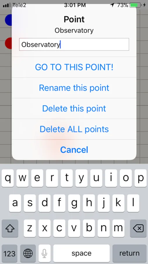 - Click on the desired point (red circle) to bring up a dialog where you can set this point as a target, rename this point or delete it. Here you can also delete all entered points.