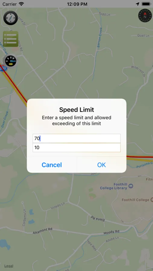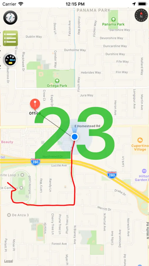 - Click the "Speedometer" button at the top left to turn the speedometer on or off. The speedometer shows your current speed in large green numbers. When the speed limit is exceeded, the numbers change color to yellow, then to red. When the speed is above the allowed limit, the speedometer will regularly speak your current speed by voice. You can set the speed limit and the allowable excess of this limit in the Speedometer Settings. Click the square button on the left-top and at the very bottom of the list that appears, click "- Speedometer Settings +". If you want to constantly hear voice messages about the current speed, then just put there 0 and 0. Under the speedometer, travel time and distance traveled are visible.