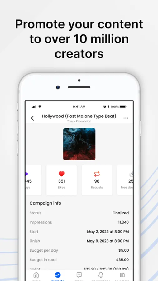 Promote tracks: Set up and manage your own campaigns to promote your tracks in front of millions of new potential customers - all from your fingertips.