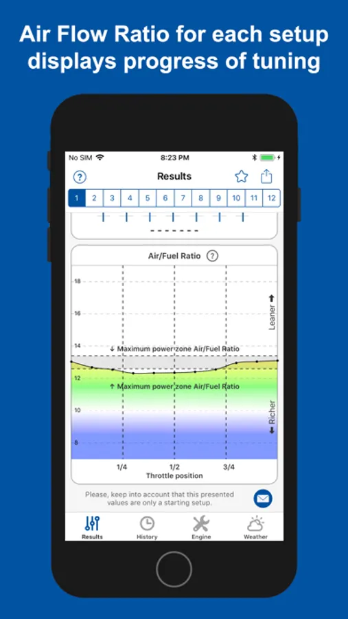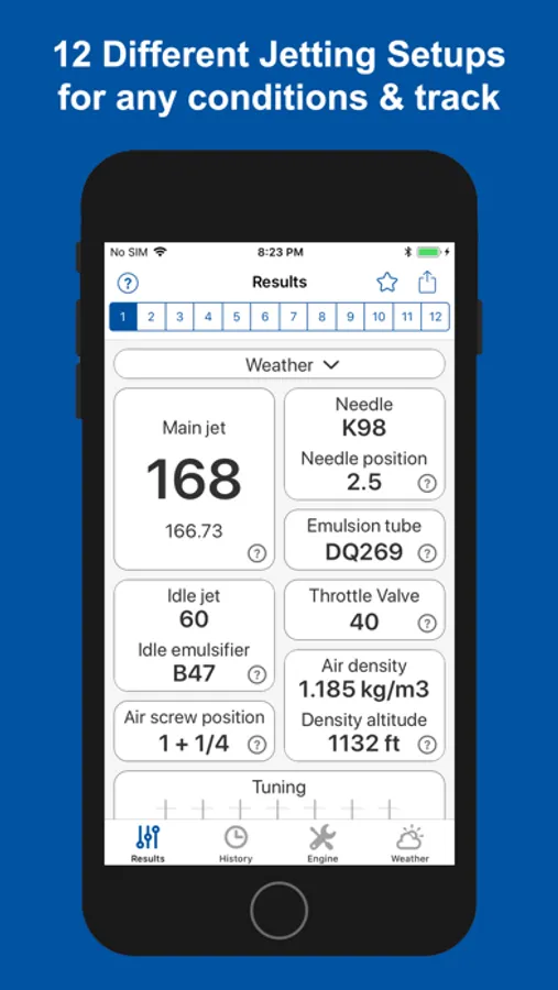 • Results: In this tab, 12 different jetting setups are shown. These data are calculated depending on the weather conditions and the engine and track configuration given in the next tabs. For each jetting setup, the following values are given: main jet, emulsion tube, needle type and needle position, idle emulsifier (inner pilot jet) and idle jet (outer pilot jet), throttle valve, air screw position.