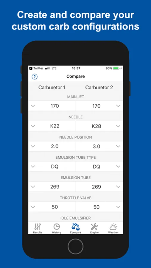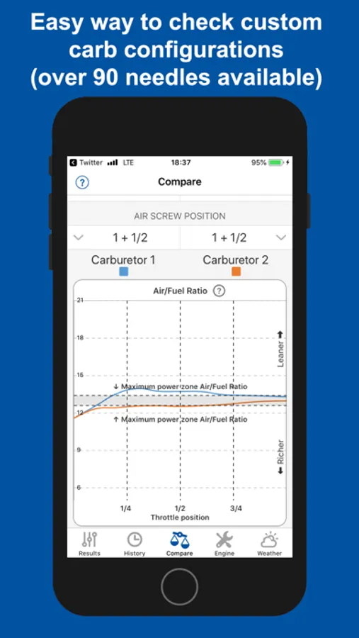 • Compare: On this tab, you can compare two carburetors. To do this, you need to set all the components of the carburetor. The result will be shown in the form of graphs of the ratio of air and fuel (or lambda).