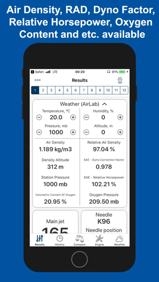 Besides this jetting information, the air density, density altitude, relative air density, SAE - dyno correction factor, station pressure, SAE - relative horsepower, oxygen pressure and volumetric content of oxygen are shown too.