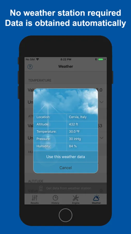 This app can obtain automatically the position and altitude to get the temperature, pressure and humidity from the nearest weather station thought internet. Internal barometer is used on supported devices for better precision. Application can run without GPS, WiFi and internet, in this case user has to enter weather data manually.