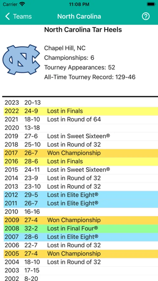 View detailed accounts of every team that has appeared in the tourney. From Cinderella upstart to Blue-Blood favorite, reminisce over each game of your team's magical run through the bracket.