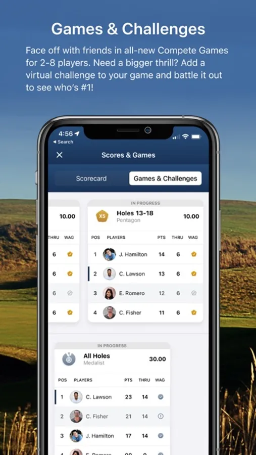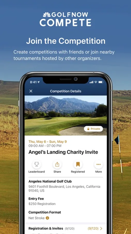 • Search for tournaments and outings near you from the Compete tab, or create your very own public or private event.