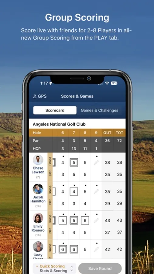 • Make every shot count and score live with up to eight golfers on the built-in scorecard