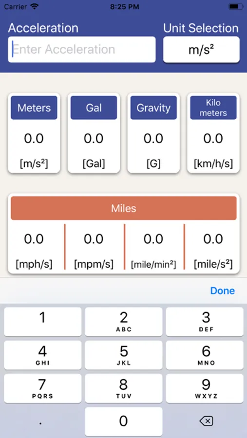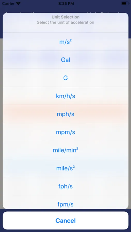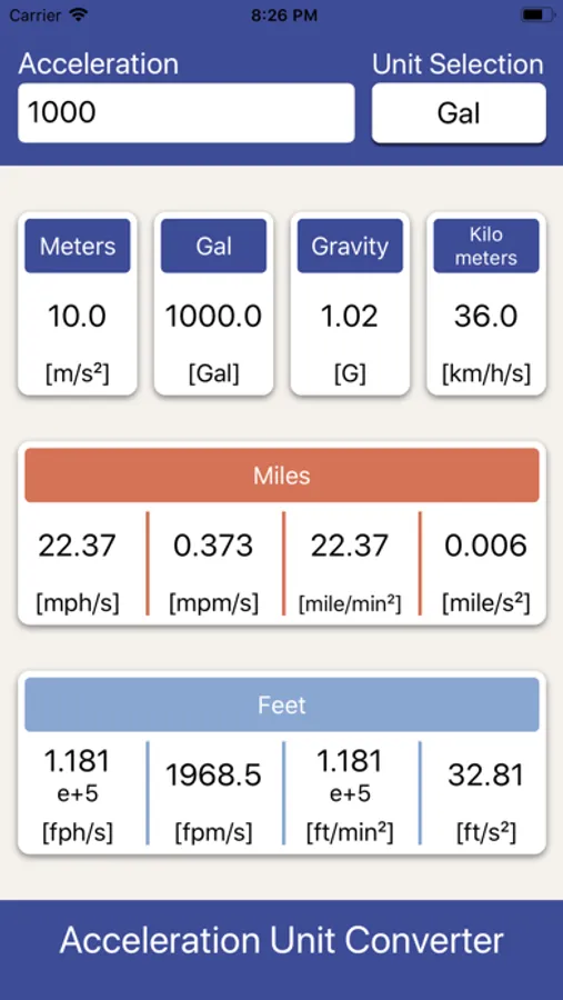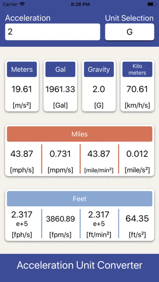Simply enter the acceleration value and select the unit of acceleration with the unit selection button, the value converted into 12 units will be displayed. Units supported by this application are as follows.