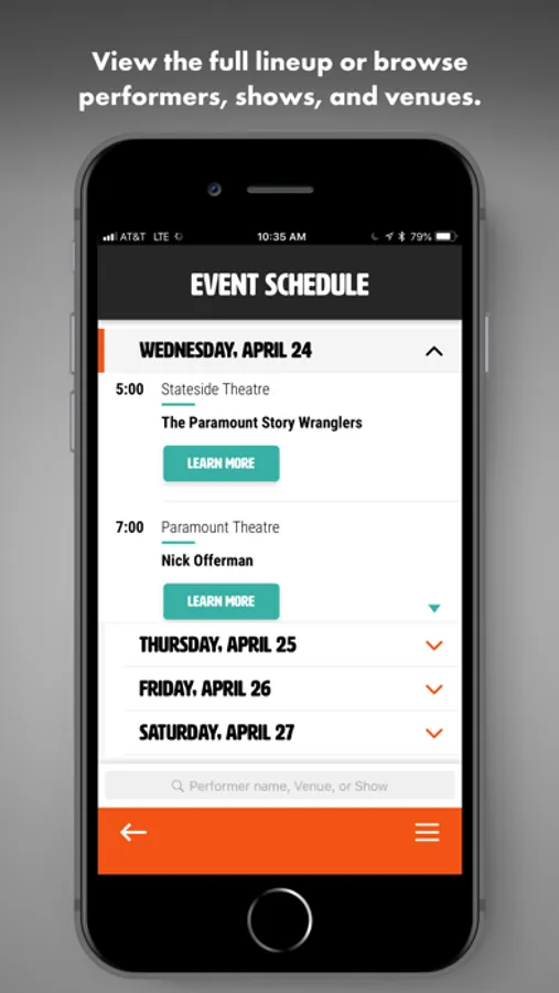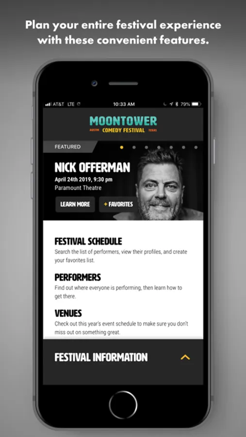 Browse profiles for Moontower artists, events, and venues. Save your favorites to a personalized list for easy planning. Watch clips of performers before their shows. Browse through the schedule and purchase tickets for individual shows. View the map to find venues. Swipe up for an easier-to-use app navigation.