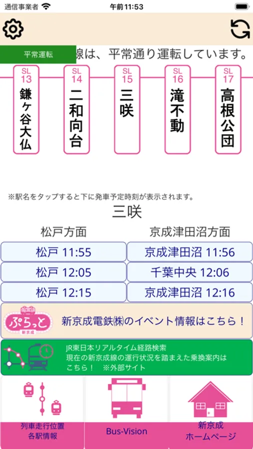 アプリ内から新京成ホームページ、ぷらっと新京成、Bus-Vision、JRリアルタイム経路検索にアクセスできます。