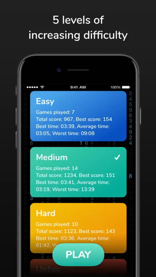 - 6 levels - beginner, easy, medium, hard, unfair and extreme.