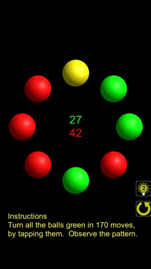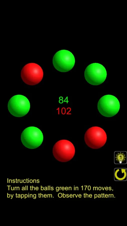 It starts with 8 red lights. The aim is to turn the 8 lights green in 170 moves. You will find that doing it in less than a 1000 moves challenging.