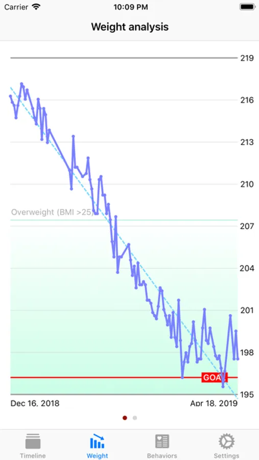 • Graphical analysis of weight history vs. target weight (incl. trend line)