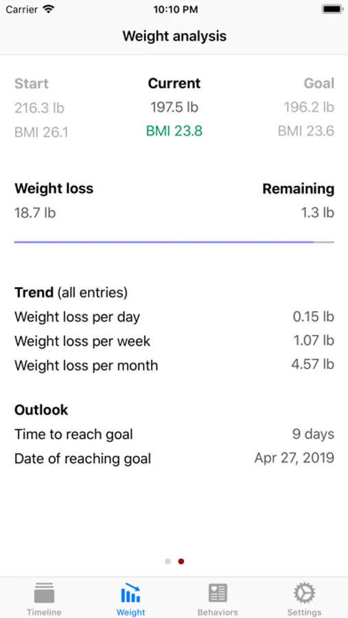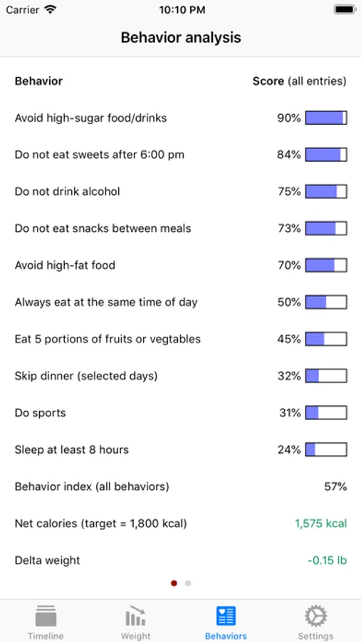 Weight Manager combines a weight diary with simple behavior tracking and insights to improve your weight loss effectiveness. Each day you can record your body weight and pragmatically log calories as well as adherence to a limited set of behavior rules.