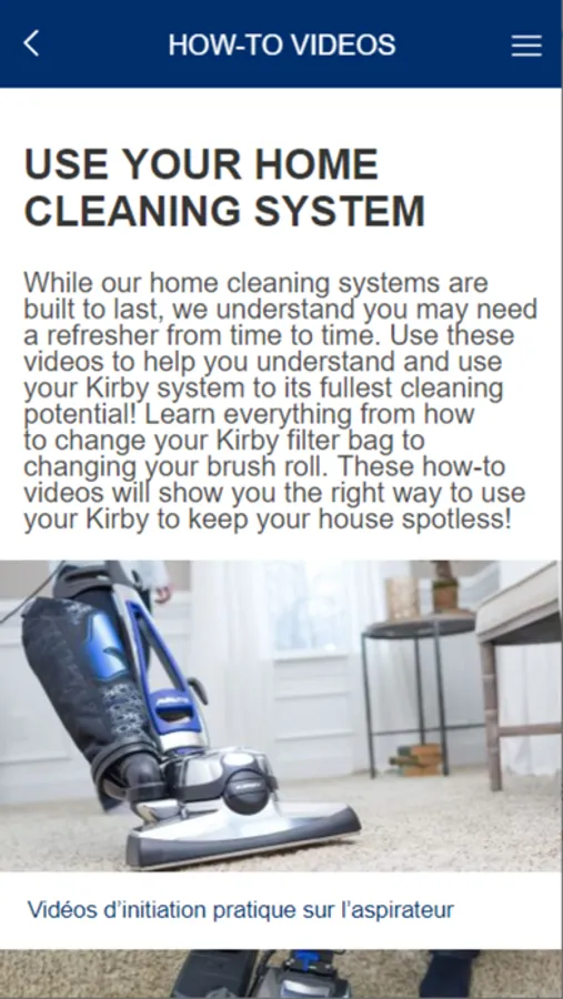 The Kirby Owner Resources App is here to provide Kirby Owner’s with product support, easy online shopping, and every Kirby owner manual right on your smartphone or tablet! This app is made for your convenience to easily connect you with how-to videos, frequent asked questions, and more, right in the palm of your hand.