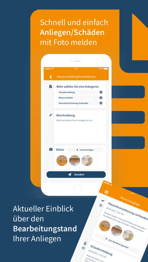 Als Mieter oder Eigentümer können Sie Schäden oder Anliegen direkt mit Fotos über unsere App melden. Ihre Anfragen stehen unseren Mitarbeitern dann zur Bearbeitung zur Verfügung und können auch an Handwerksbetriebe weitergeleitet werden.