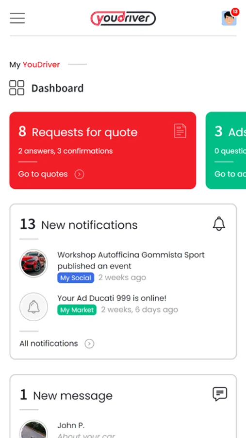 YouDriver is an online community enabling you to find services on the go, request quotes, buy - sell accessories and talk about motors. A new way of thinking about the automotive world.