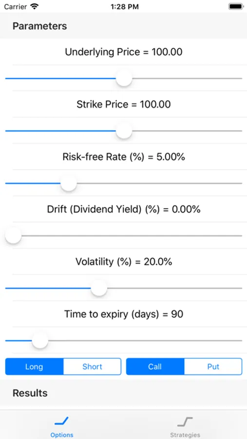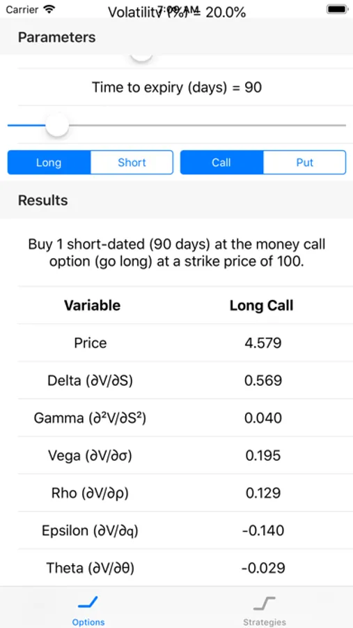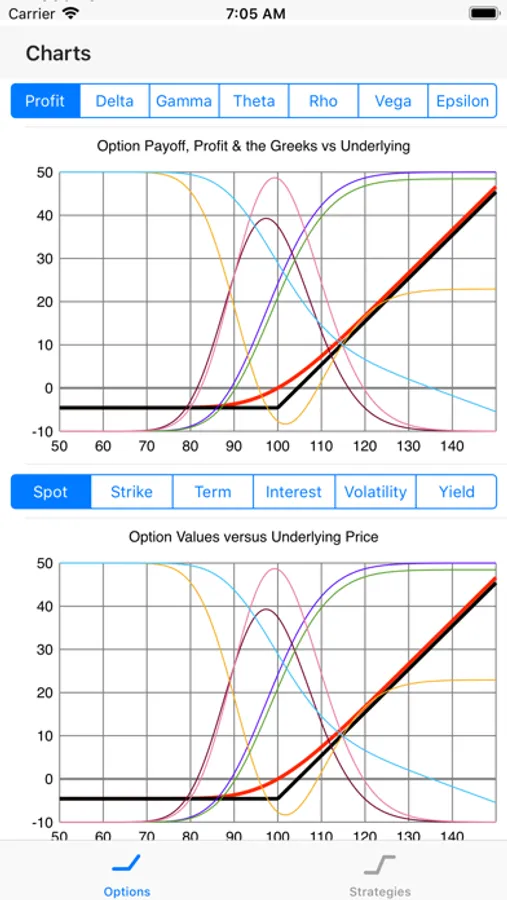 The Options tab will calculate the theoretical price of options, given the user's choice of the relevant parameters (using sliders) which include the spot price of the underlying instrument, the strike price of the option, the risk-free interest rate (discount rate), the volatility of the underlying spot price (implied volatility), the yield of the underlying instrument, and the term to maturity (or expiry) of the option (in days). It will also calculate the values of the "Greeks", which includes delta, gamma, theta, rho, vega, and epsilon. It displays all of these in charts against each of the underlying parameters (as selected by the user).