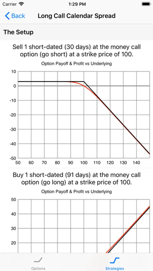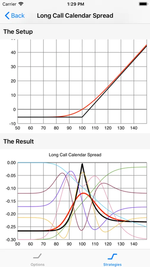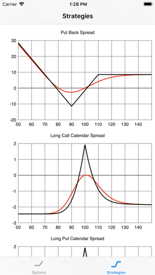 The Strategies tab includes many different option strategies (a combination of one or more options, as well as the underlying asset), so that you can see the payoff profile, price and the greeks for these strategies / combinations.