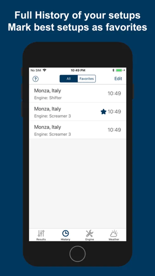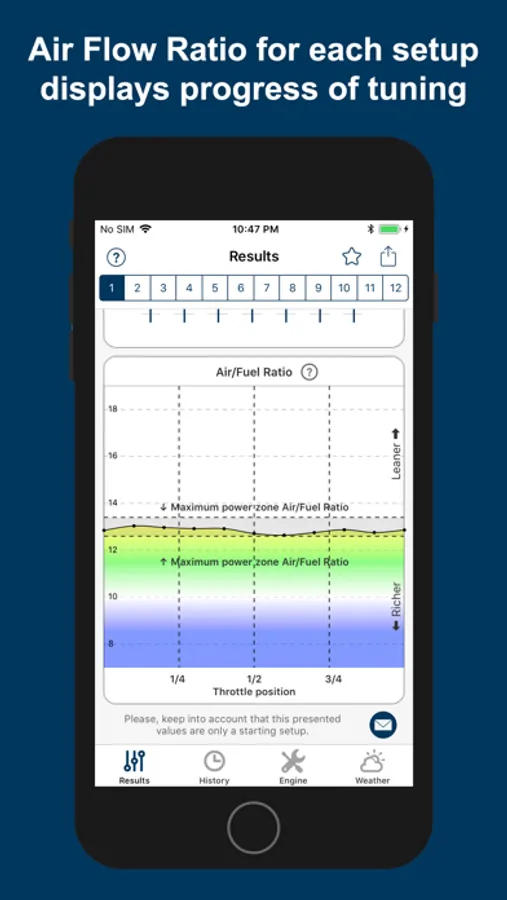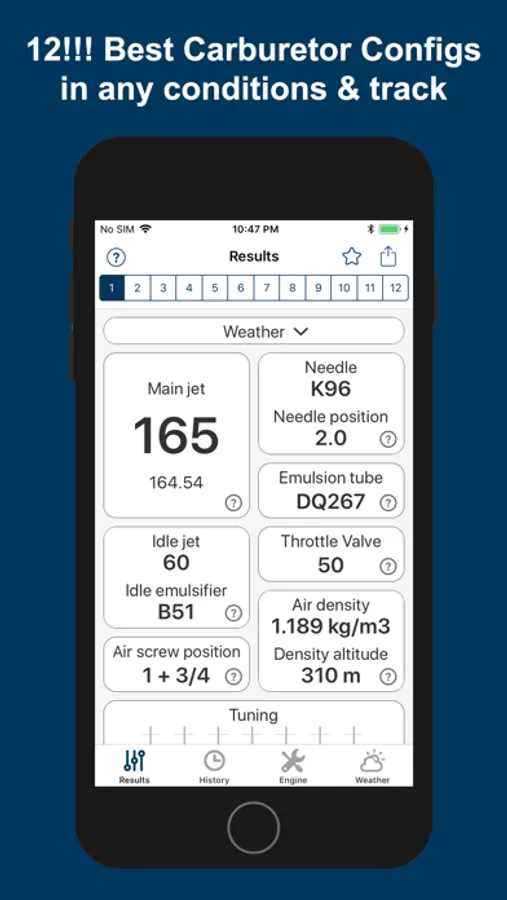 • History: This tab contains the history of all jetting setups. If you change the weather, or engine setup, or fine tuning, the new setup will be saved in history.