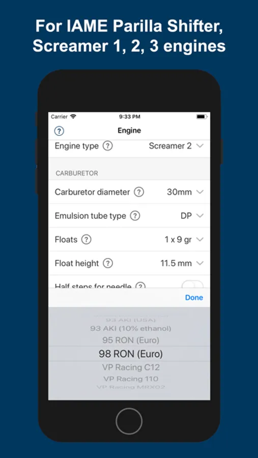 This app provides, using temperature, altitude, humidity, atmospheric pressure and a given engine configuration (engine model, floats, carb bore, emulsion tube type, floats, oil ratio, fuel type), 12 !!! jetting recommendations for IAME (Parilla) Screamer 1, Screamer 2, Screamer 3, Shifter, X30 engines that have DellOrto VHSH 30 carbs.