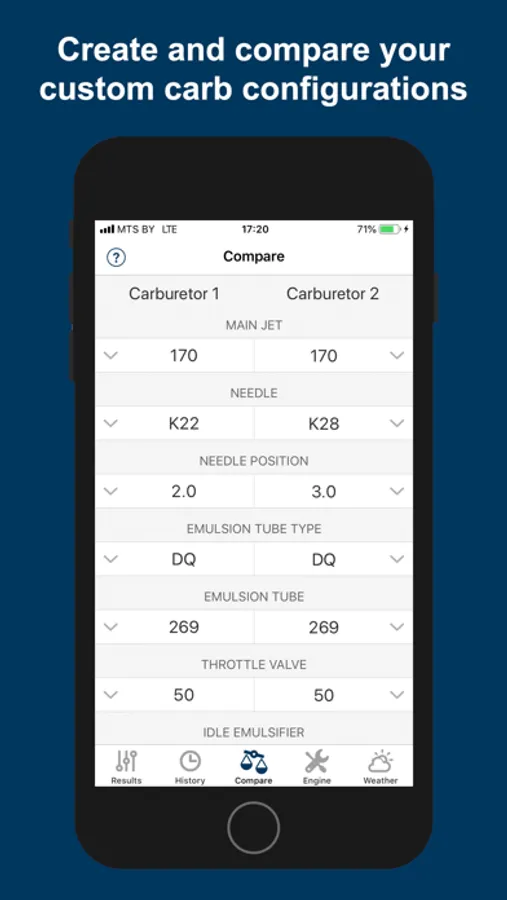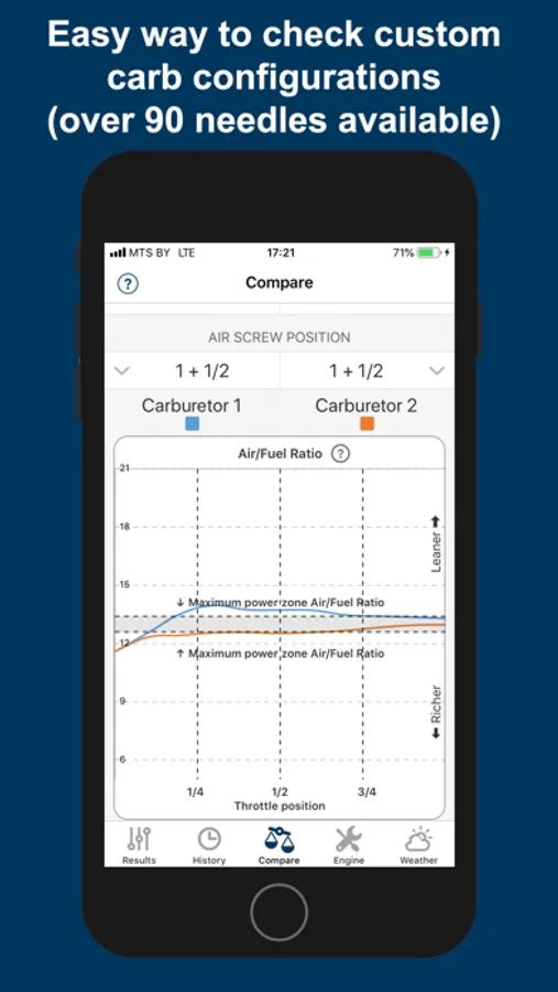 • Compare: On this tab, you can compare two carburetors. To do this, you need to set all the components of the carburetor. The result will be shown in the form of graphs of the ratio of air and fuel (or lambda).