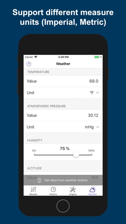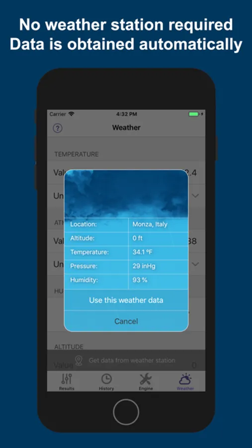 This app can obtain automatically the position and altitude to get the temperature, pressure and humidity from the nearest weather station thought internet. Internal barometer is used on supported devices for better precision. Application can run without GPS, WiFi and internet, in this case user has to enter weather data manually.