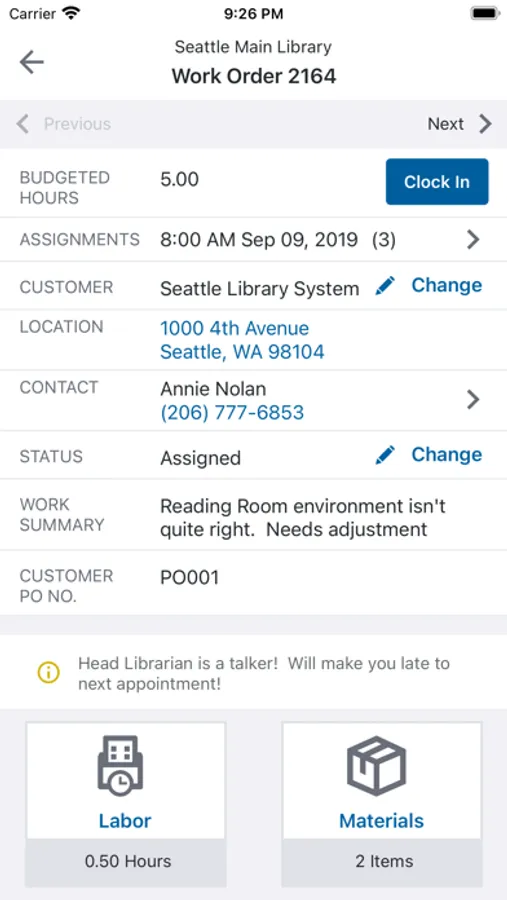 Service Tech Mobile allows technicians to receive work order assignments directly from the office (Spectrum) and then enter time, notes and pictures against the work order. All of the data entered into Service Tech Mobile will be available to the Spectrum Work Order module within moments of connecting to the internet.