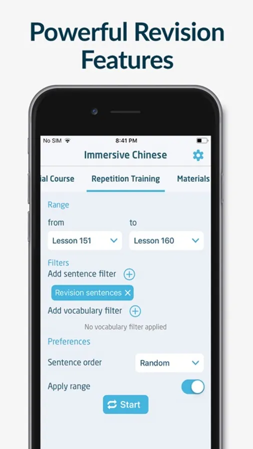 Research into language acquisition has shown that repetition of comprehensible content is one of the most effective ways of learning a language. Repetition Training is a core feature of Immersive Chinese that allows you to play a specific selection of content on a continuous loop according to a number of different settings. You can set the specific time delay before and after each sentence, use normal speed or slow recordings, repeat each sentence a certain number of times, and use a random or sequential order. You can also add custom filters, so you only study the exact material you want to.
