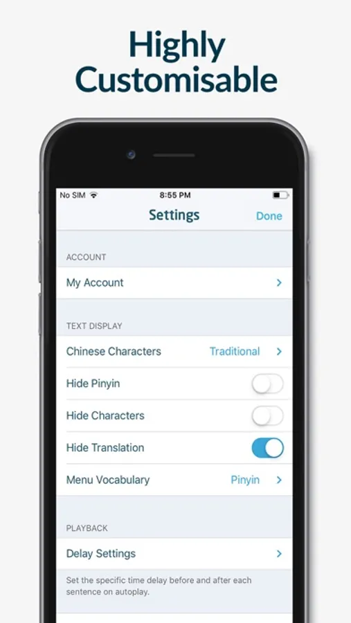• Highly customisable audio playback (set the exact time delay between sentences).