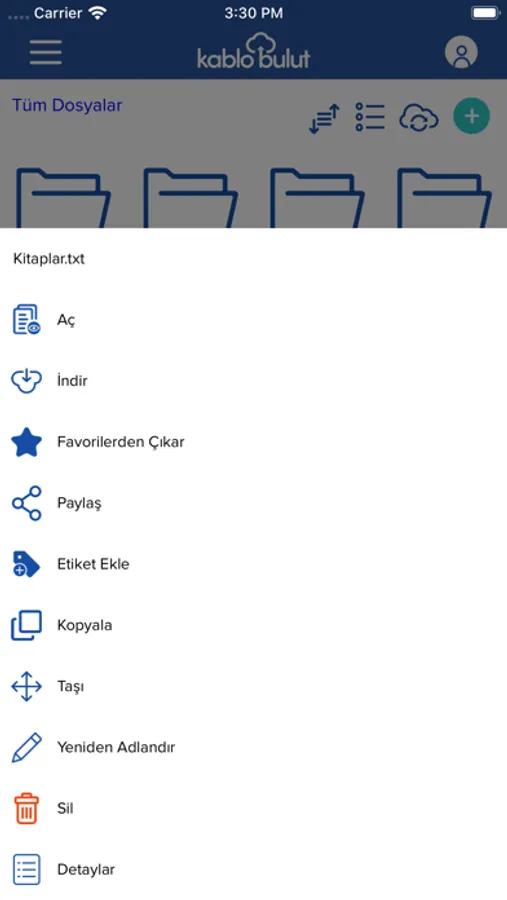 Kablo Bulut uygulaması sayesinde dosyalarınızı indirebilir ve paylaşabilir, herhangi bir uzantıdaki (.png, .txt., .pdf, .jpeg, .psd, vs) yeni dosyalar yükleyebilir, dosyalarınızı kendi telefonunuzda yer kaplamadan depolayabilirsiniz! Ayrıca;