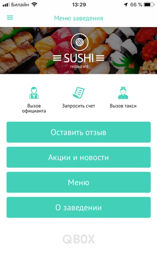 - Поучаствовать в дисконтной системе заведения, получив карту клиента в приложении Qbox, подписаться на push-уведомления об акциях заведения