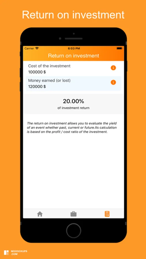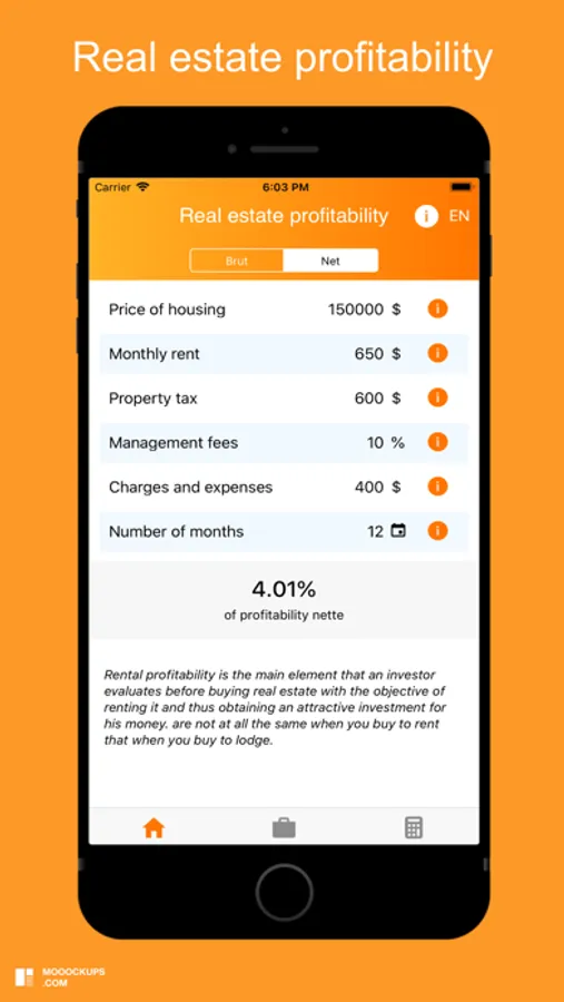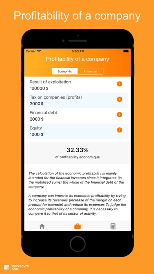 The Profitability application allows you to calculate quickly and quickly the gross and net real estate return (rental yield), the profitability of a company (economic and financial) and the return on investment.