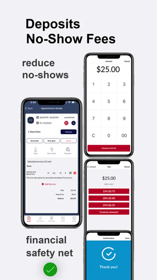 Why is it essential to have an online payment solution in the app? Clients will pay a deposit when they schedule and the rest once the services are rendered. That is a guarantee that you get your money immediately. We have integrated Stripe and Square, both online payment methods you can use to collect payments.