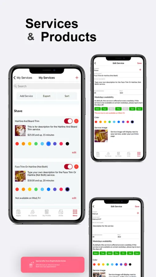 * Services (categories, services, costs, duration, pictures)