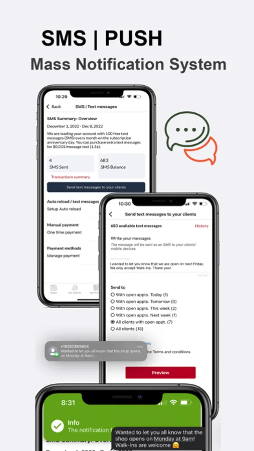 * Send Mass SMS, Push Notification, Or Email To Your Clients
