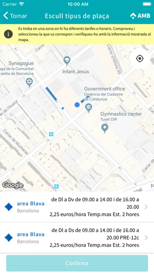 - L’app et mostrarà la data i l’hora d’inici, les tarifes, els horaris i el temps màxim d’estacionament.