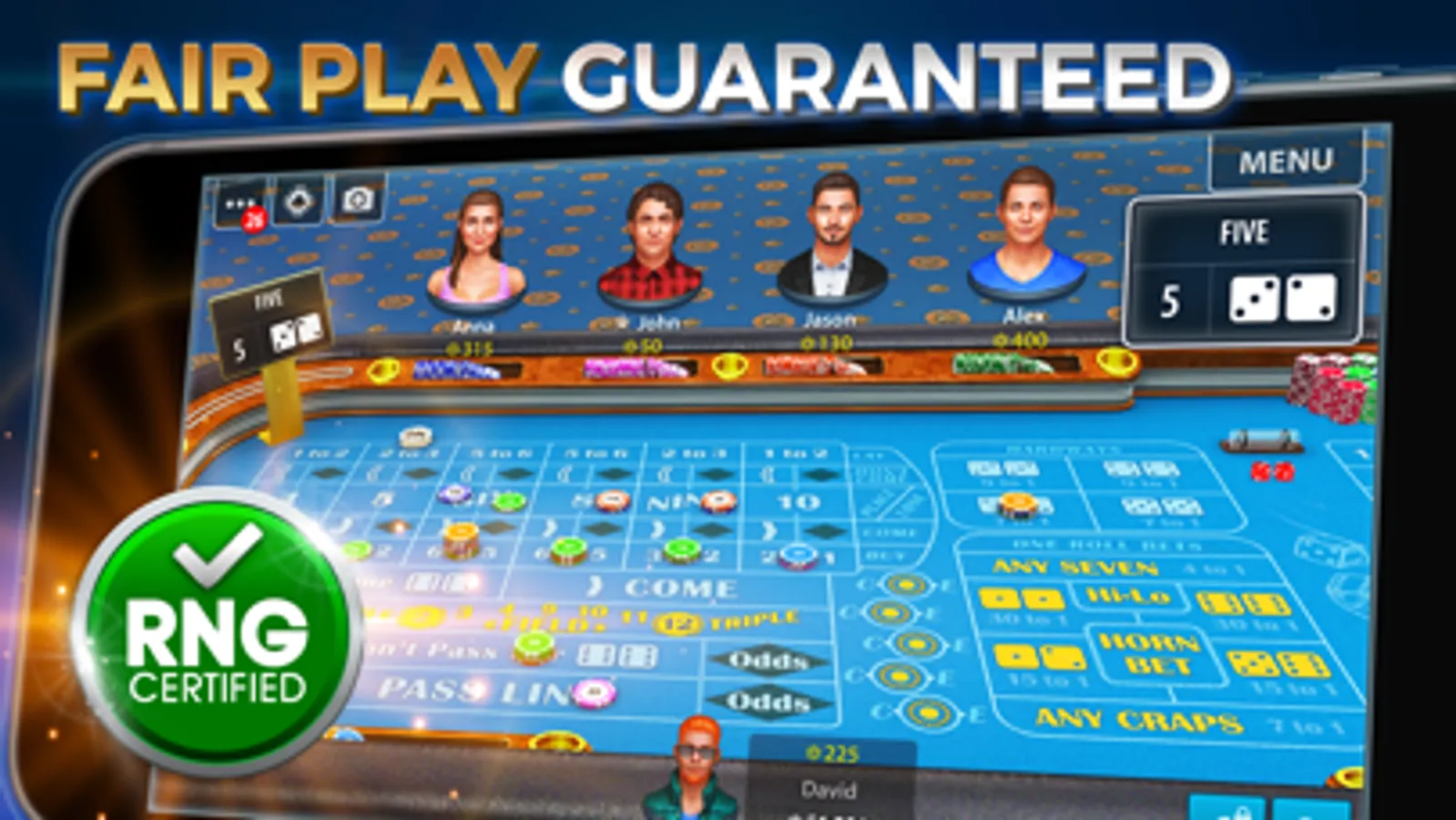 • FAIR PLAY GUARANTEED – Our certified Random Number Generator (RNG) gives you the best and fairest craps experience!