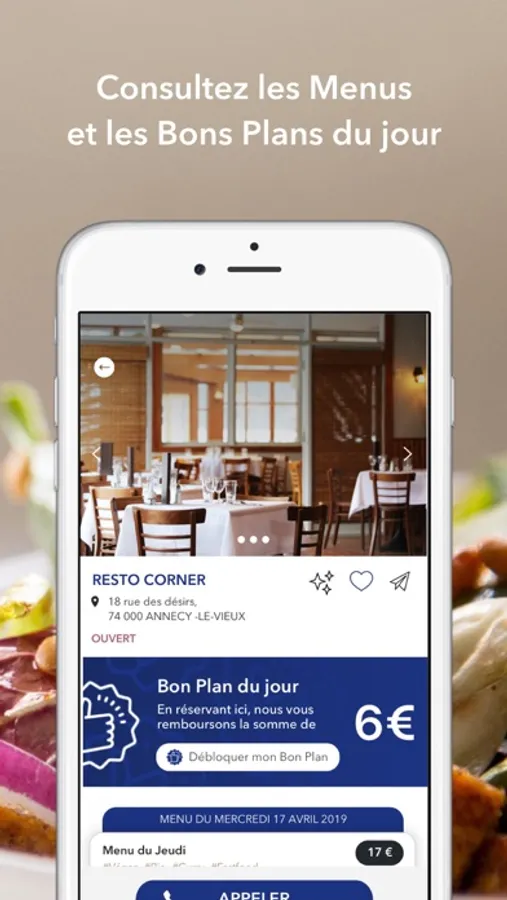 Et, régulièrement, des milliers de Bons Plans offerts : jusqu'à 15€ remboursés sur votre repas au resto, midi ou soir, sur simple envoi de la photo de votre addition.