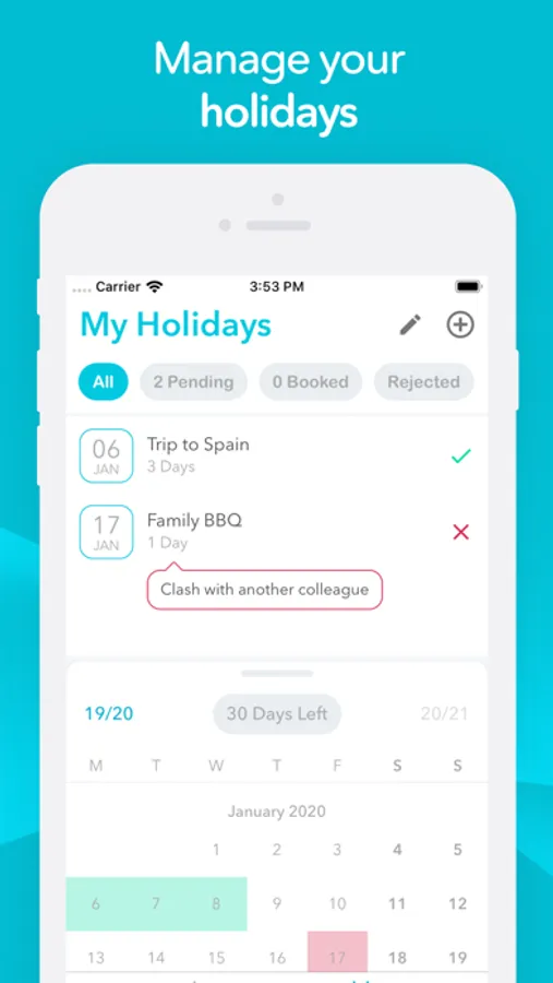 • Manage your employees' holidays, accept and reject requests, and set their entitlement