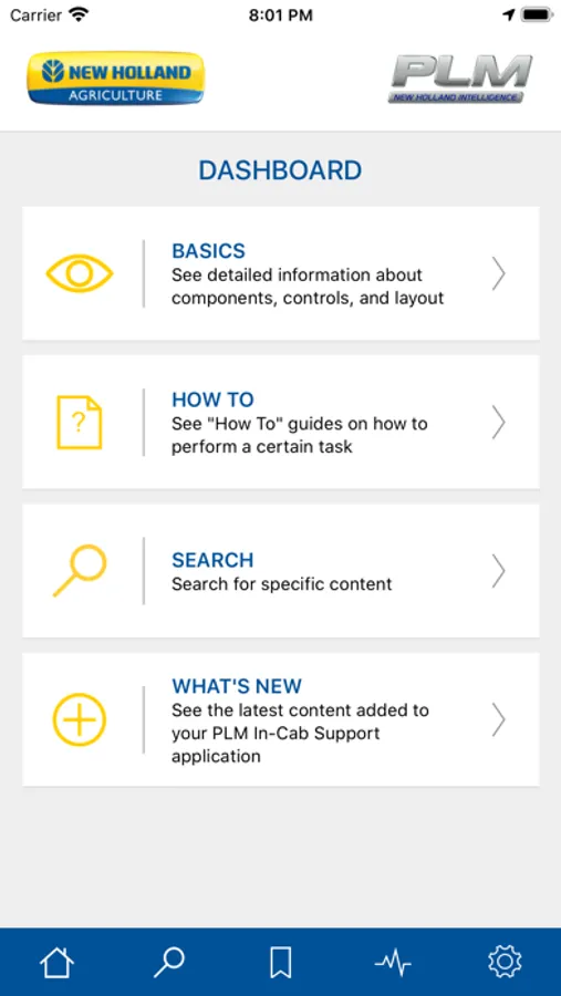 The New Holland PLM In-Cab Support App will provide the operator support material to operate the IntelliView 12 and SideWinder Ultra Armrest.