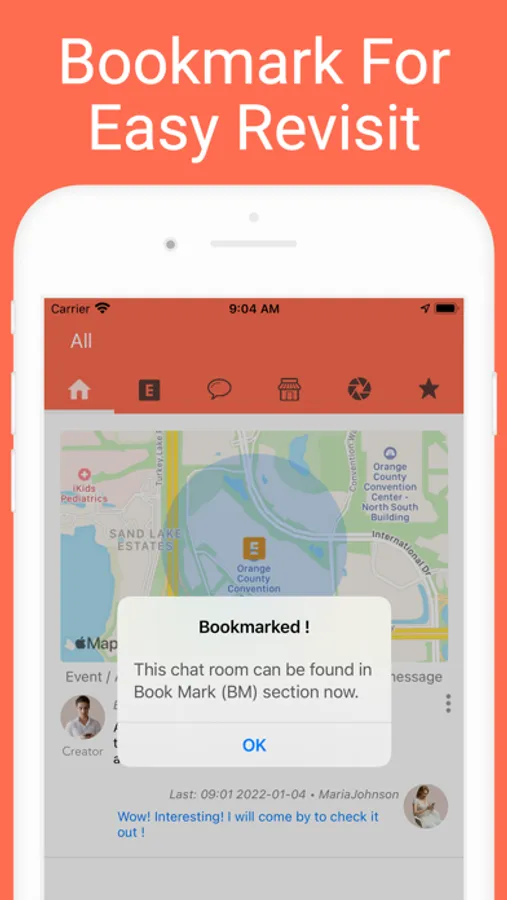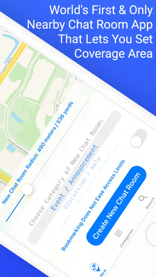 • Chat rooms are organized by category, sorted by distance(closest on top), can be bookmarked for easy access later.