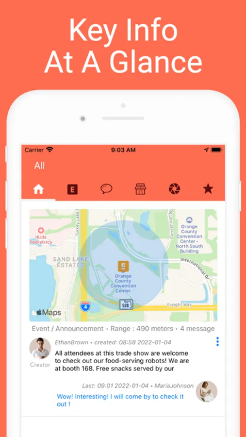 • At professional networking events, you can broadcast the type of people you are looking for (e.g. prospective clients, customers, business partners, contractors, hiring managers, job seekers) to ALL attendees currently at the event venue, those matching prospects can be quickly & easily pinpointed and you can meetup with them right away - Much more efficient ! In this situation, Proche is like your compass for navigating in big crowds !