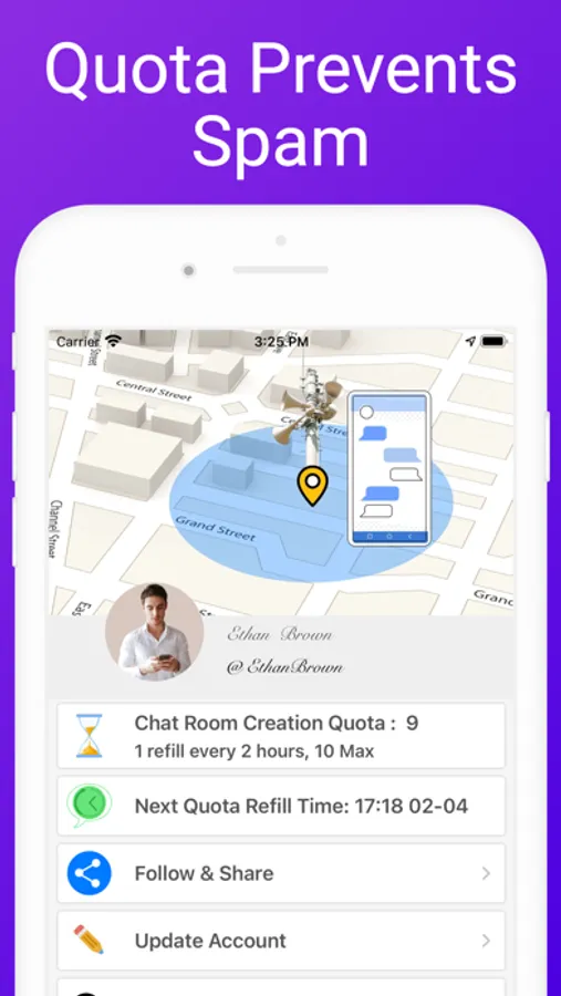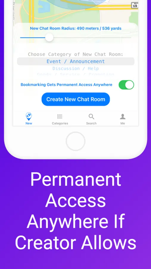 • Create geofenced chat rooms in few seconds. Its accessible area is a circular area centered at your current location with the radius you define (10 meter to 2 kilometers). It will stay this way even if you move later on.
