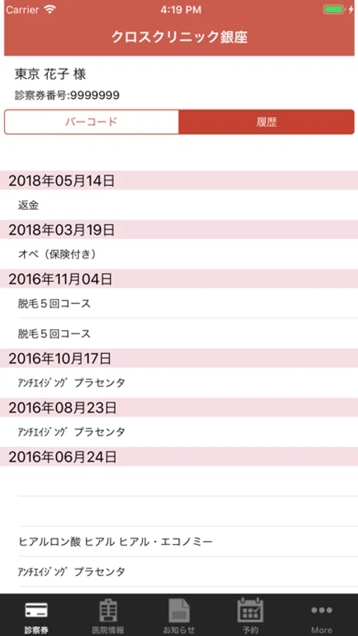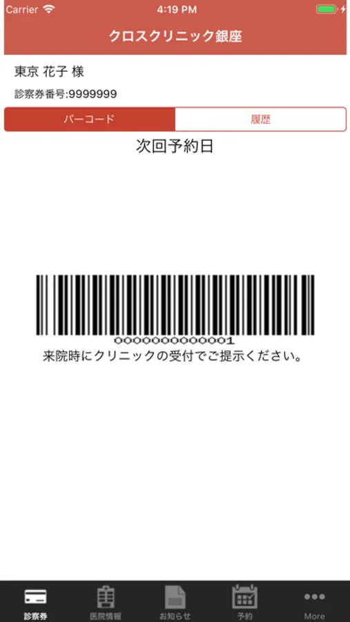 バーコードをかざすだけで受付出来るチェックイン機能、オンライン予約、次回予約日時の表示などが簡単にできます。