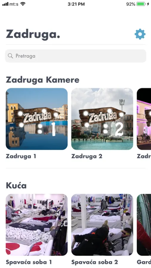 Aplikacija Zadruga.tv vam nudi mogućnost da reality Zadruga pratite 24 časa, na više od 26 strimova, ali i putem 360° kamera, i uz VR naočare. Pomoću aplikacije Zadruga.tv možete sami da birate koju od 24 prostorne zone želite da gledate i da interaktivno učestvujete u kreiranju reality programa Zadruga.