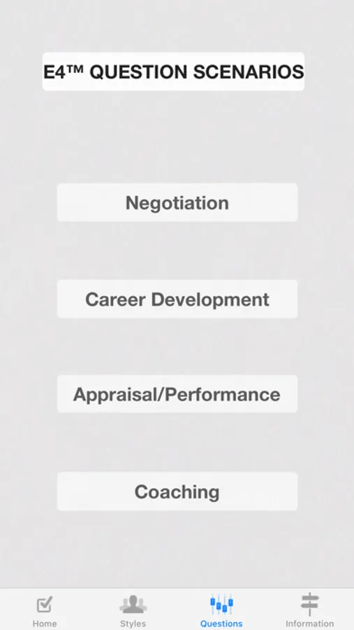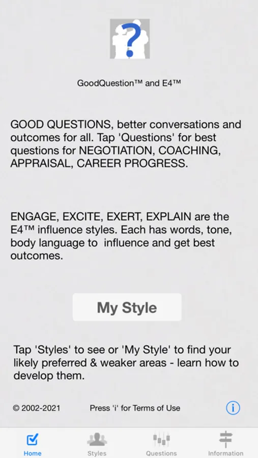 GoodQuestion™ and the E4™ model offer insight into communication and influence styles & ideas to improve on your non-preferred styles. Also included are lots of good questions for 4 situations: coaching, career development, negotiation and appraisal/performance management.