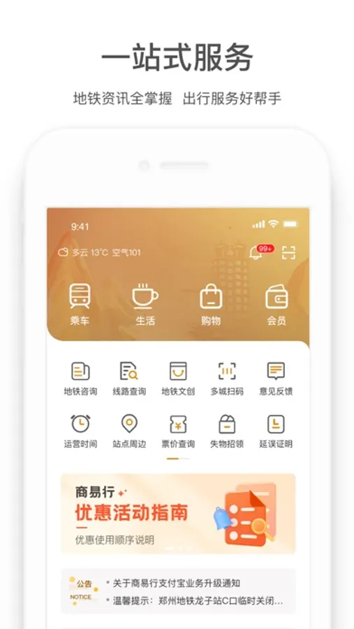 商易行APP专注于城市公共交通智慧出行,致力于“你乘车,我买单”出行理念,旨在为郑州地铁出行用户提供优惠乘车服务,降低公共交通出行成本,以及提供更丰富的地铁生活圈周边服务。优惠乘地铁,查询地铁信息,就用商易行。