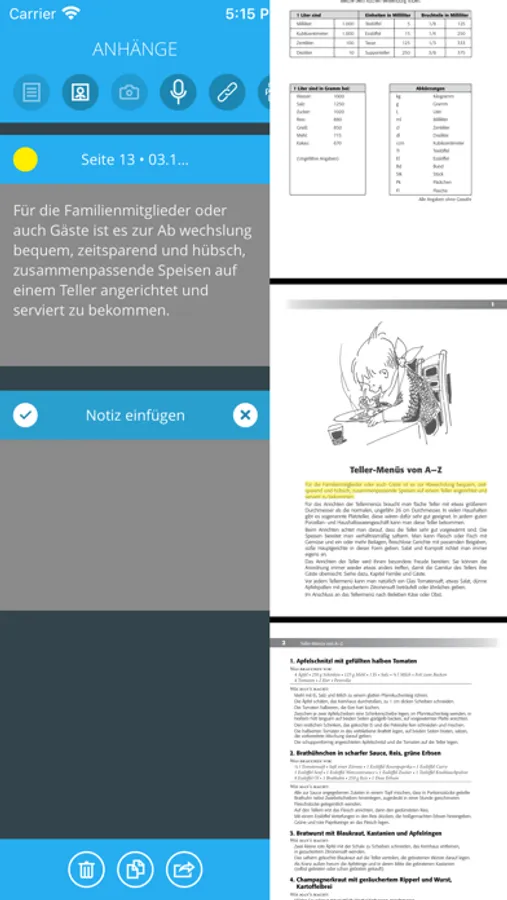 Fügen Sie kommentierte Lesezeichen ein und heften Sie eigene Annotationen in Form von Texten, Bildern, Fotos und Audiokommentaren an beliebige Textstellen.