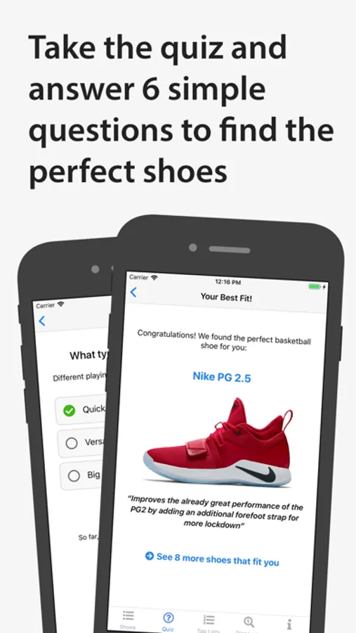 Take the quiz, answer 6 questions about your playing style, the shape of your feet and the type of court you play on, and the app finds your perfect fit.