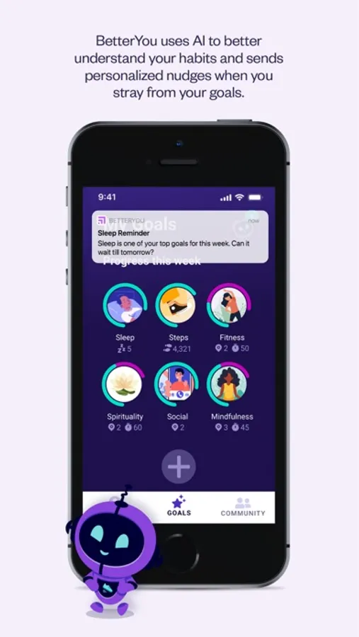 Personalized recommendations - BetterYou learns your habits and is able to give you a personalized nudge when you’re off track, keeping you working toward your goals. BetterBot is your Healthy Habits Companion giving you your personalized notifications to help you reach your goals.